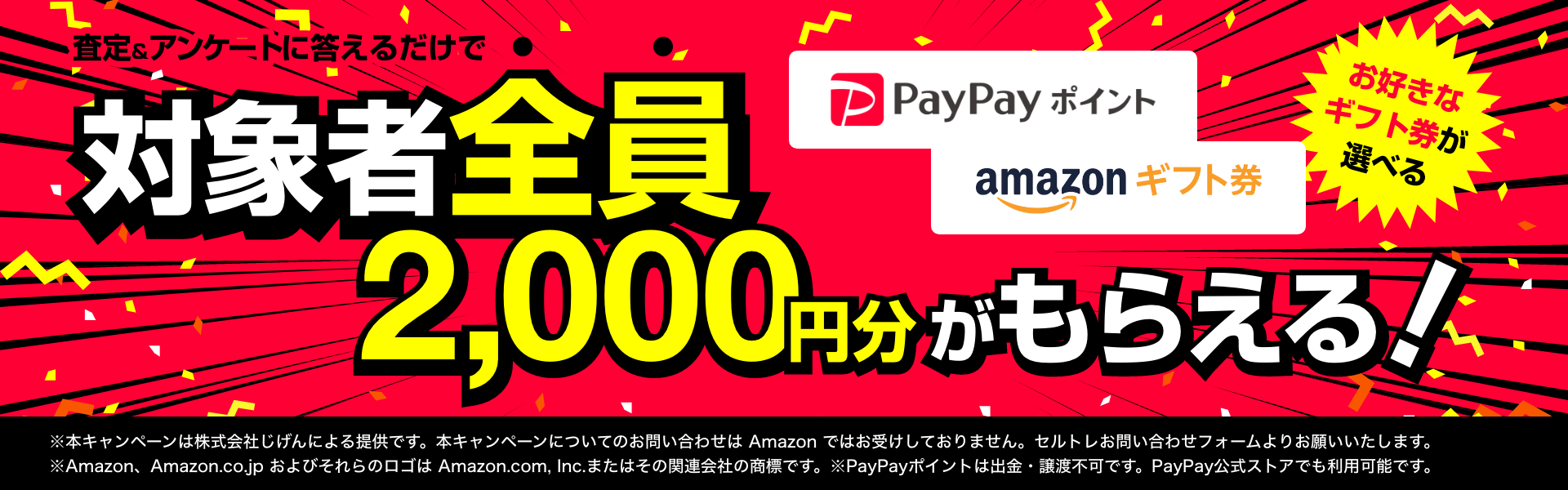セルトレでお問い合わせをしたうえで、愛車の査定金額や査定した会社の評判をご回答いただくことで、お祝いとお礼を兼ねて、Amazonギフト券やPayPayポイントなどお好きなギフト券と交換のできる2,000円分のデジタルギフト券をプレゼントするキャンペーンです。